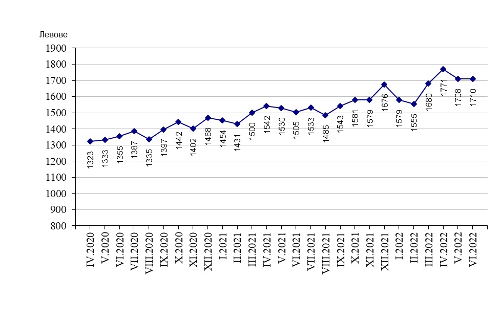 По предварителни данни на Националния статистически институт междинната брутна месечна работна заплата за април 2022 година е 1 771 лева, за май - 1 708 лева, и за юни - 1 710 лв..