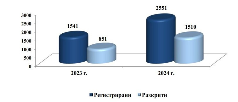 Увеличение от 8,4% се установи при измамите. От записаните 1426 закононарушения от този тип са разкрити 213. Разкриваемостта понижава с 3,1 пункта (от 18% на 14,9%). При телефонните измами се регистрира нарастване от 85% - регистрирани са 272 телефонни измами по отношение на 147 за 2023 година