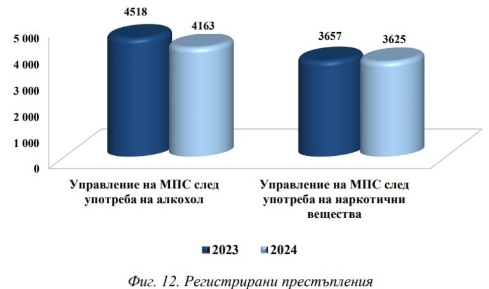 Регистрираните случаи на ръководство на МПС след приложимост на алкохол са 4163 против 4518 за 2023 година Разкриваемостта е 89,8% или с 4,8 пункта по-ниска по отношение на 2023 година (94,6%). При ръководството на МПС след приложимост на наркотични субстанции се установи понижение с 0,9%, като разкриваемостта понижава с 10 пункта.
