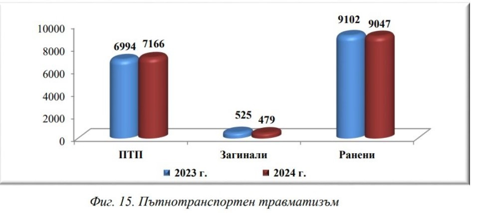 През 2024 година са настъпили 7166 тежки пътнотранспортни катастрофи, нарастването е със 172 броя (2,5%) по отношение на 2023 година При тези пътни катастрофи са починали 479 и са ранени 9047 души, като починалите са с 46 по-малко (8,8%), а ранените с 55 по-малко (0,6%). Най-много тежки произшествия са регистрирани на територията на област Варна (825), в София-град (747) и област Пловдив (595), а минимум - в областите Ямбол (49), Силистра (70) и Габрово (72). Най-голям е броят на починалите при произшествия в област Пловдив (57), Ловеч (36), София-град (33) и Варна (30), а минимален - в Габрово (2), Смолян (3) и Видин (4).