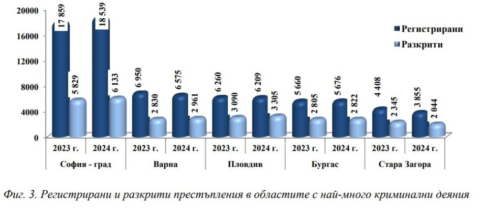 Най-много престъпни действия са регистрирани в София-град - 18 539 (22,2% от общия брой) и областите Варна - 6575 (7,9%), Пловдив - 6209 (7,4%), Бургас - 5676 (6,8%) и Стара Загора - 3855 (4,6%). Най-малко закононарушения са регистрирани в областите Смолян - 644 (0,8% от общия брой), Силистра - 886 (1,1%), Кърджали - 1001 (1,2%), Видин и Търговище - по 1070 (1,3%), Габрово - 1120 (1,3%) и Разград - 1159 (1,4%).