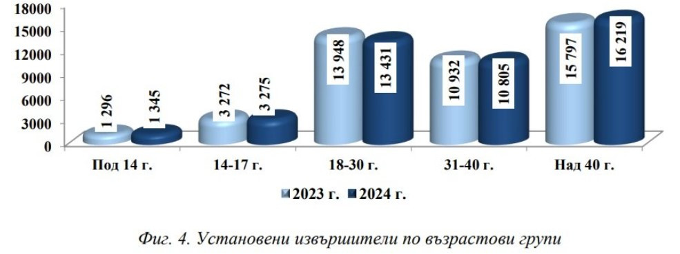 През 2024 година са открити са 45 075 причинители на закононарушения (вкл. регистрирани през предишни години). Основната част от тях - 36% са на възраст над 40 години и сред 18 и 30 години - 29,8%. Непълнолетните лица (14-17 години) са 7,3%, а малолетните причинители (под 14 години) съставляват 3%.