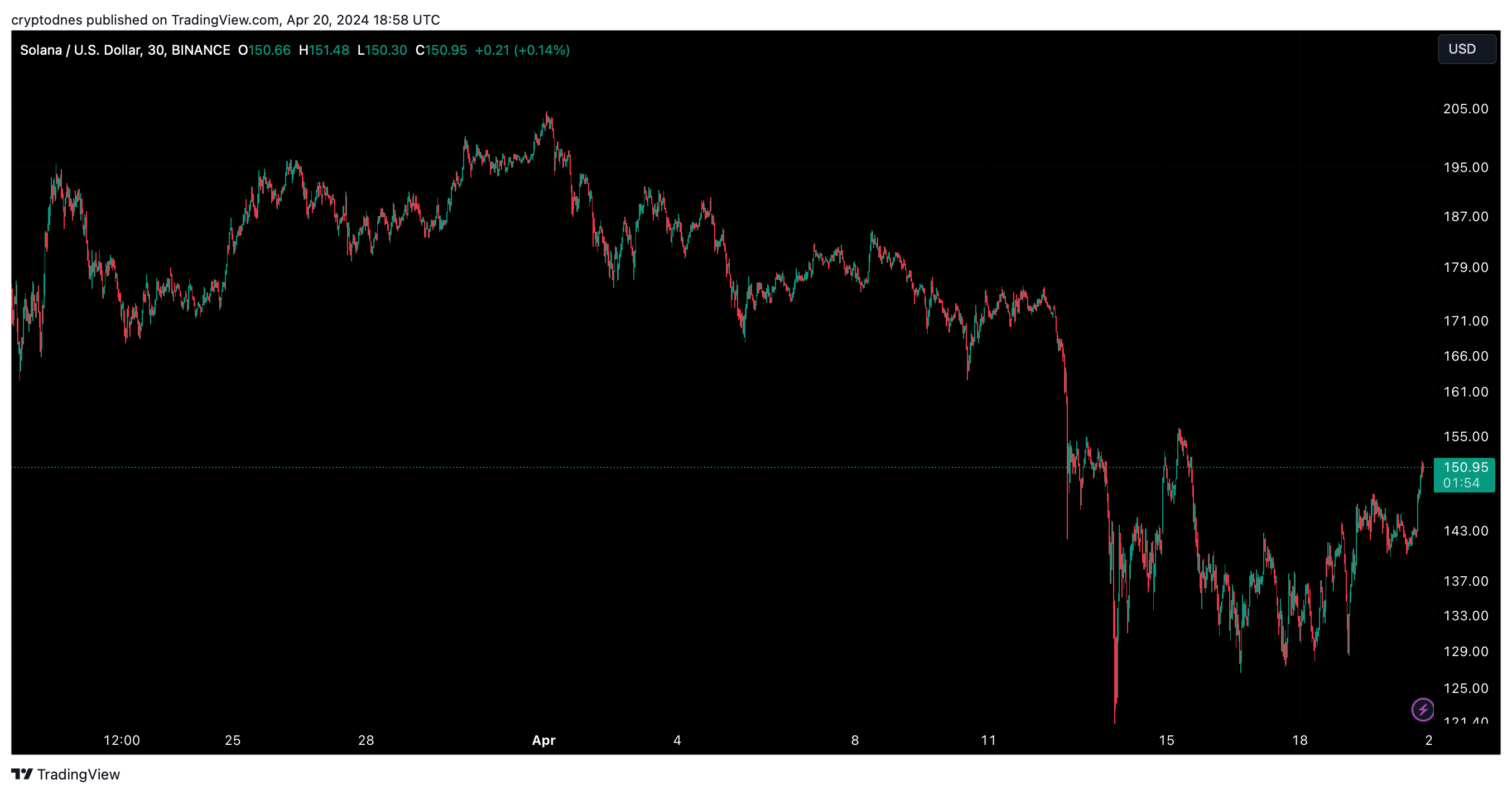 Solana ( SOL ) отрази тази наклонност, като стана очевидец на забележителен спад, последван от бързо възобновяване. Понастоящем цената на Solana възлиза на $150, отбелязвайки съвсем 4% растеж през последните 24 часа, надминавайки цената си преди ответните дейности на Израел против Иран.