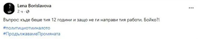 Лена Бориславова дава отговор на просташки език, разяснява във Facebook профила си медийният консултант на ГЕРБ Севделина Арнаудова. По-рано шефката на кабинета на премиера в оставка насочи въпрос към водача на ГЕРБ Бойко Борисов след изявлението му по-рано през днешния ден. Бориславова написа: „ Въпрос: къде беше тия 12 години и за какво не ги направи тия работи, Бойко?! ”. Тя е поставила даже знак за отпратка в обявата си „ политици от предишното ”.