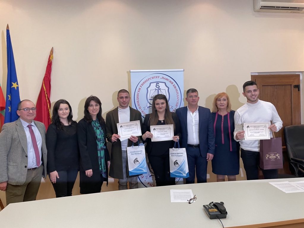 По случай 60-годишнината на Пловдивския университет, Студентския празник и 30-годишнината на Юридическия факултет, управлението на Факултета взаимно с Районен съд – Пловдив и Адвокатска гилдия – Пловдив връчиха награди на участници в Конкурса за изявени студенти. От участниците бяха отличени трима петокурсници от Юридическия факултет, които с изключение на с отличен триумф, впечатлиха журито с научноизследователски достижения, присъединяване в разнообразни начинания, свързани с научно творчество и занимания отвън региона на правото.