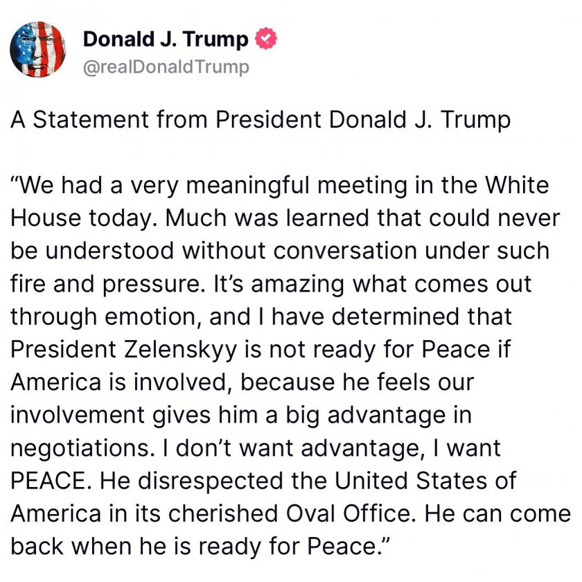 Имахме доста смислена среща в Белия дом. Много може да се научи в диалог под огън и напрежение. Невероятно е какъв брой можеш да научиш в разговор и аз научих - президентът Зеленски не е подготвен за Мир с присъединяване на Америка, тъй като си е въобразил, че ние му даваме огромно предимство. Аз не желая предимство, желая МИР. Той се подигра със Съединените щати в свещената Овална зала. Може да се върне, когато е подготвен за МИР.