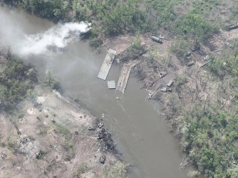 Украинското Министерство на защитата популяризира фотоси, които удостоверяват известията за сполучливата офанзива на украинските сили против построения от руснаците понтонен мост на Река Северски Донец в региона на Северодонецк, предотвратила прекосяването на реката и напредването на съветските войски към град Лиман.