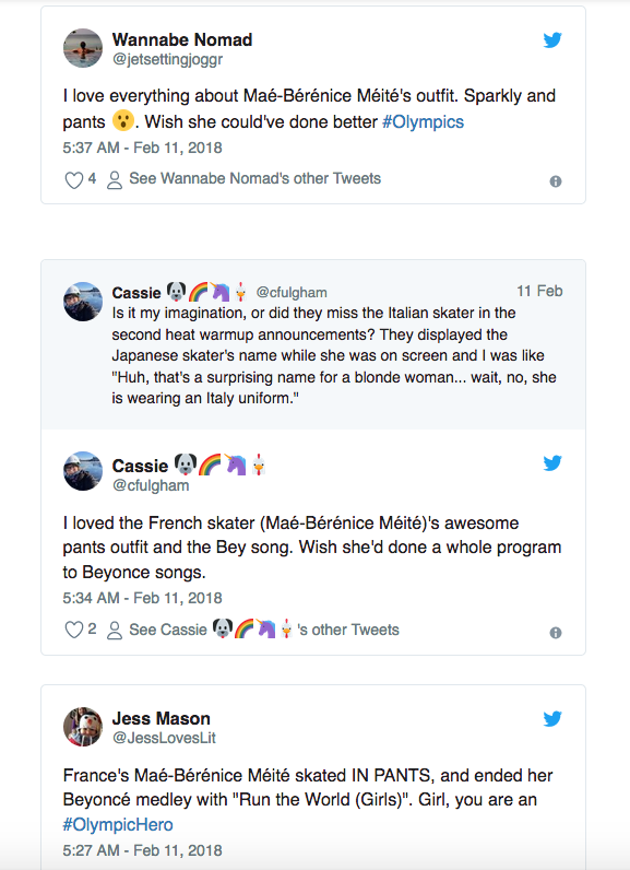 По време на късата стратегия при дамите, френската фигуристка Мае-Беренис Меите си завоюва място в сърцата на феновете, изпълнявайки композицията си под звуците на шлагерите на Бионсе Halo и Run the World. Това обаче не беше единственият акспект от нейното осъществяване, който впечатли публиката. Другият бе костюмът й.