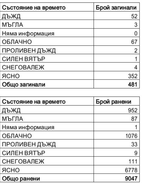 По време на снеговалеж, пороен дъжд и мъгла през миналата година са починали 10 души или 2% от всички починали при произшествия през годината. Докато когато времето е било изсъхнало, слънчево и удобно за придвижване са починали 352 души или 73% от всички намерили гибелта си на пътя. Това излиза наяве от подробен разбор на Института по пътна сигурност.