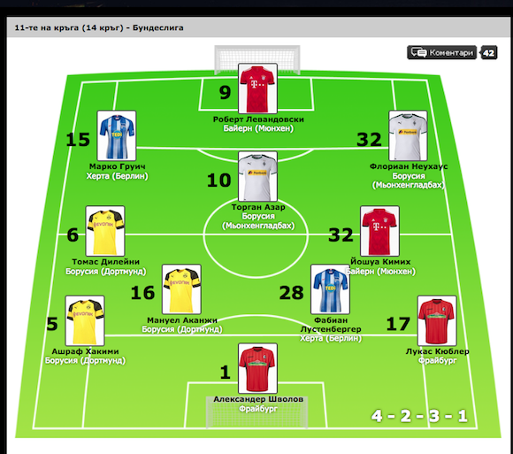 Вторият в класиране Борусия (Мьонхенгладбах) се изтеза против Щутгарт, само че с влизането на младия Флориан Нойхаус, отчел се с гол и асистенция, съумя да пречупи противника за крайното 3:0. Логично надареният халф също е измежду отличените, както и съотборникът му Торган Азар, който не стопира със мощните игри.
