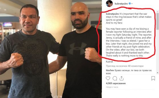 Кубрат Пулев пък заяви в формалния си профил в обществената мрежа Инстаграм, че е другар с репортерката и по тази причина я е целунал след изявлението.