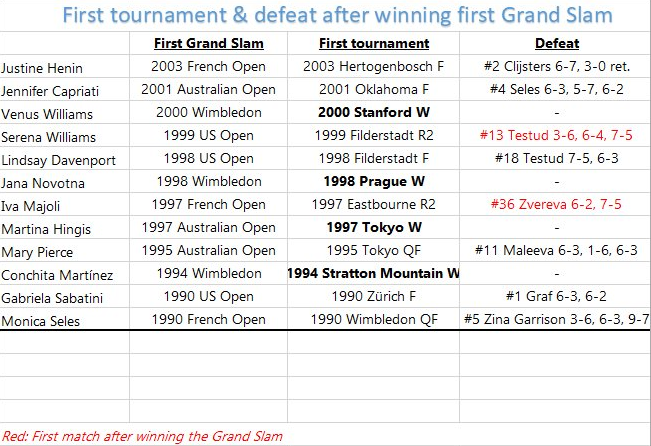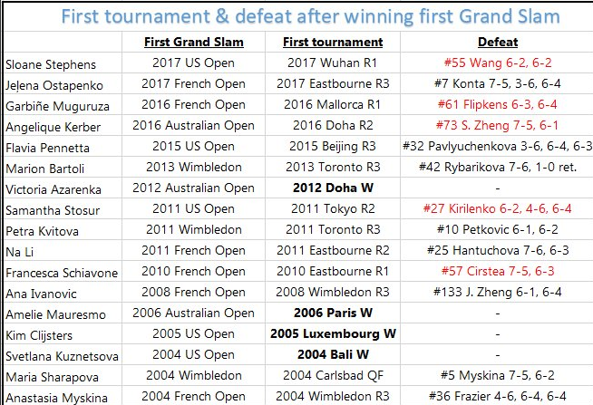 От 1990 година насам Слоун Стивънс бе 29-ата състезателка, която се причислява към елитния клуб на шампионките от Големия шлем, тъй като триумфът в Ню Йорк бе дебютен за нея в най-престижните и мощни съревнования. Само че поради провалянето в Ухан тя стана част от единствено седем състезателки (в този интервал от 1990 досега), които са изгубили първия си мач след първата купа от Шлема.