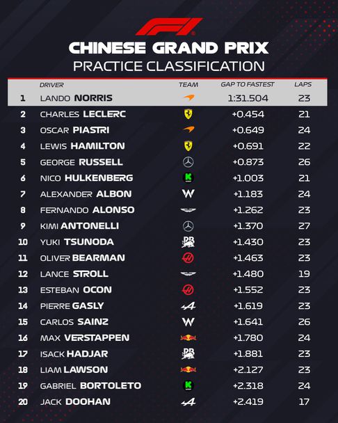 Тройката с пасив от 0.649 оформи съотборникът на Норис в Макларън Оскар Пиастри, който позволи сериозна неправилност в последния завой в своя заключителен тур, която му коства много време. Четвъртата позиция в единствения час за подготовка в Шанхай зае Люис Хамилтън, който бе с 0.691 по-бавен от Норис.