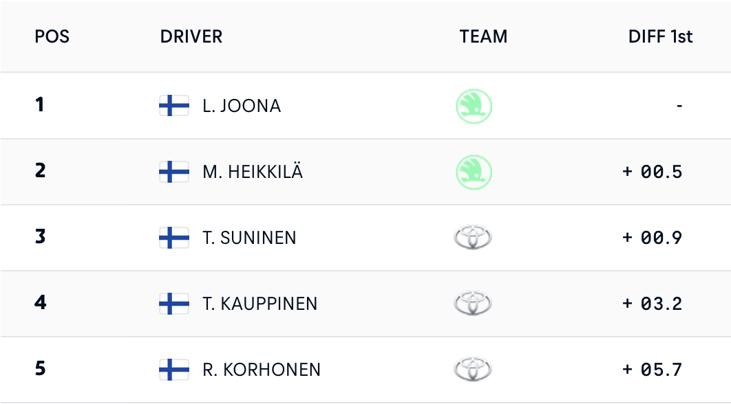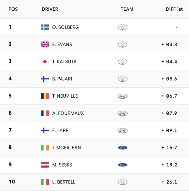 Трети на 4.4 зад Солберг се класира още един водач на Тойота – Такамото Каццута, а превъзходството на японския производител в челото оформи Сами Паяри, който се подреди четвърти, изоставайки с 5.6 от водача. Петото място зае първият от водачите на Хюндай Тиери Нювил, който записва пасив от 6.7 и приключи на 1.2 пред съотборника си Адриен Фурмо. Третият водач на корейците и победител в Швеция преди две години Есапека Лапи даде седмо време при завръщането си във водещата категория на WRC след година и половина неявяване.