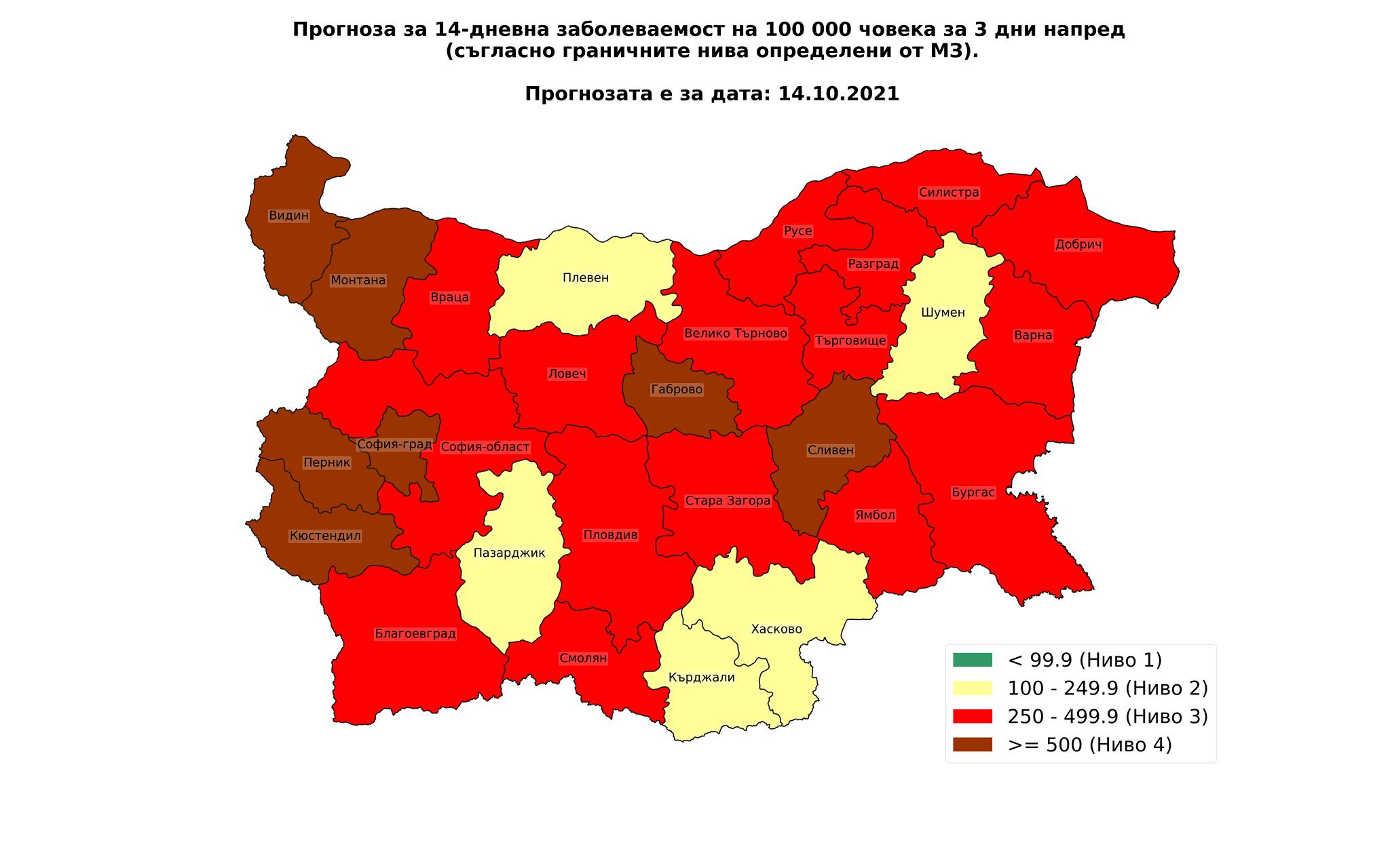 Следва прогнозната карта за 14-дневната заболеваемост.