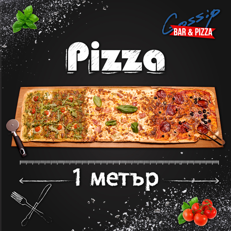 Най-новият шлагер в него е пица, дълга... 1 метър. Още по-хубавото е, че тя може да не е напълно от един тип, а всеки клиент или компания има опция да си я комбинира съгласно усета си. Защо да избирате дали да ядете Маргарита, Капричоза или Неаполитана, когато можете да си ги поръчате и трите вкупом? В Gossip Bar & Pizza това е изцяло допустимо.