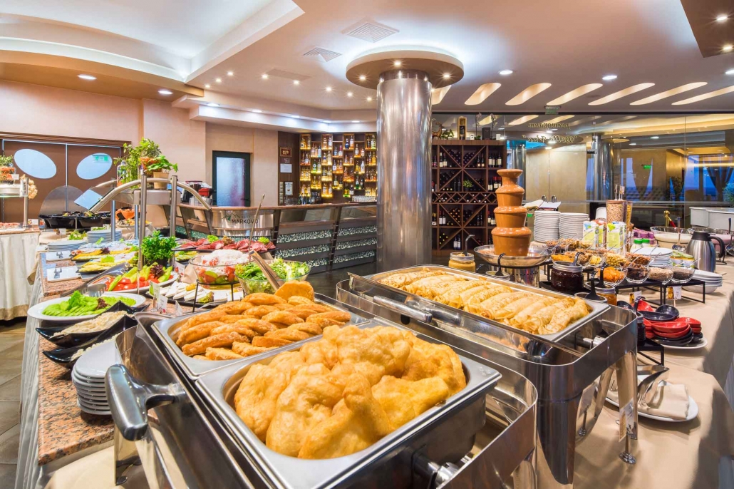 Ще се насладите на извънредно богата на подбор блок маса за закуска и вечеря , включваща прясно изцедени сокове, кафе еспресо, многообразие от висококачествени месни и безмесни деликатеси, сирена и салами, на момента изпечени цели прасенца и още в обилие.