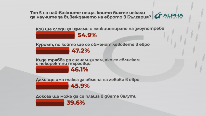 Сред най-важните тематики, от които се интересуват хората, са кой ще следи за измами и злоупотреби след въвеждането на еврото и къде ще могат да се подават сигнали за това, какъв е курсът, по който ще се обменят левовете в евро, както и докога ще може да се заплаща и в двете валути.