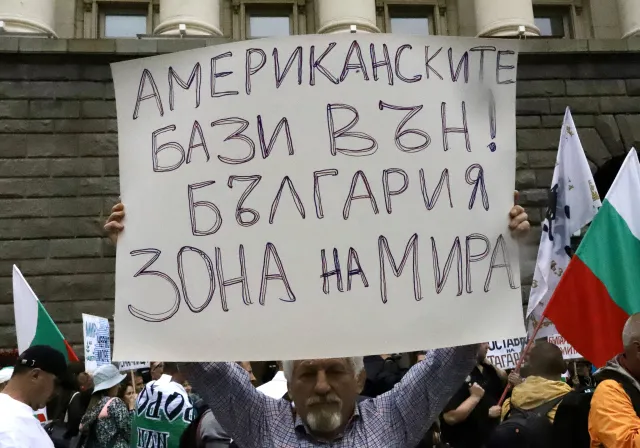 Демонстрацията е пред някогашния партиен дом. Те скандират - " Долу сглобката " и " Денков вън ".