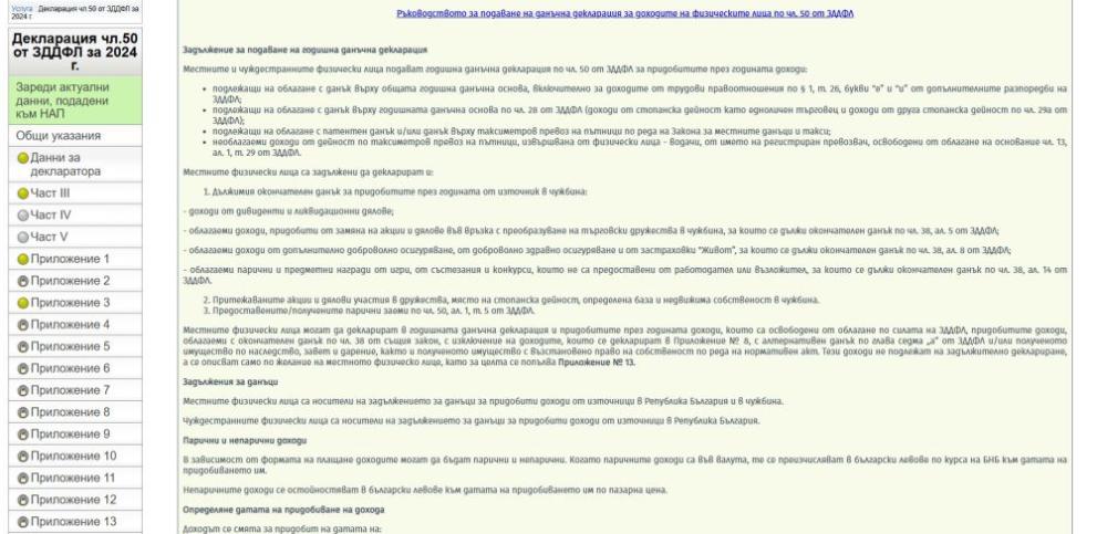 След това декларацията ще ви се покаже. От лявата страна с жълт цвят са маркирани приложенията, които би трябвало да попълните.