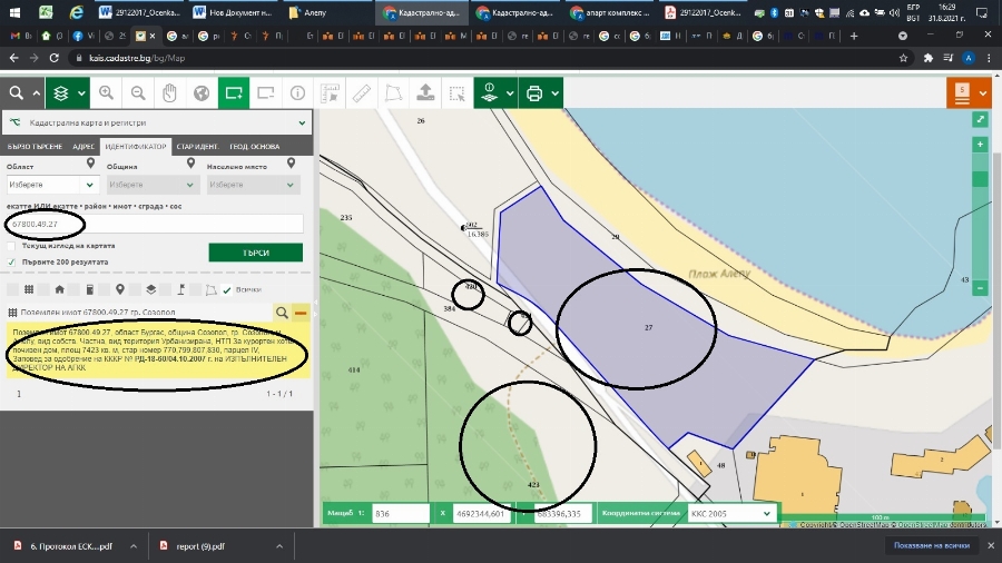 (В синьо е маркиран първият парцел, който е до морето, или мястото, на което в този момент има издигната конзола за бъдещия градеж, който ще е безусловно върху нея)