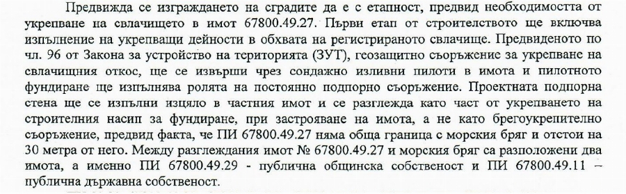 В документа е посочено, че плановата подпорна стена ще се извърши напълно в частния парцел и се преглежда като част от укрепването на строителния насип за фундиране, при застрояване на парцела, а не като брегоукрепително оборудване. Това е по този начин, тъй като въпросният парцел няма обща граница с морския бряг и отстои на 30 метра от него. Между него и морския бряг са ситуирани два парцела, единият от който е обществена общинска, а другият - обществена държавна благосъстоятелност.