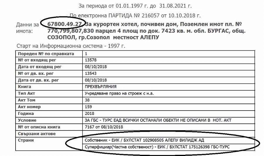 Справка в Имотния указател сочи, че е погрешна и тиражираната информация за продажба на парцела. Той към днешна дата продължава да е благосъстоятелност на първичния вложител – „ Алепу Вилидж “ АД. А суперфициар – т.е., притежател на правото на градеж продължава да е „ ГБС-Турс “ ЕАД.