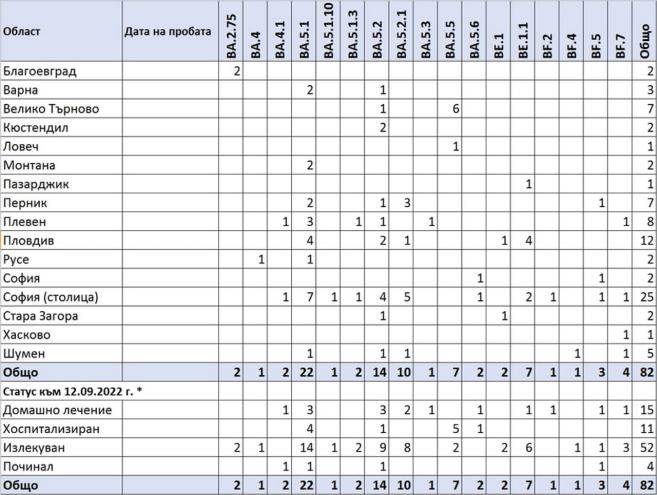 Пробите са взети от пациенти с COVID-19 в интервала 02.08-02.09.2022 година и са изпратени от 17 разнообразни лечебни заведения от 16 области на страната.