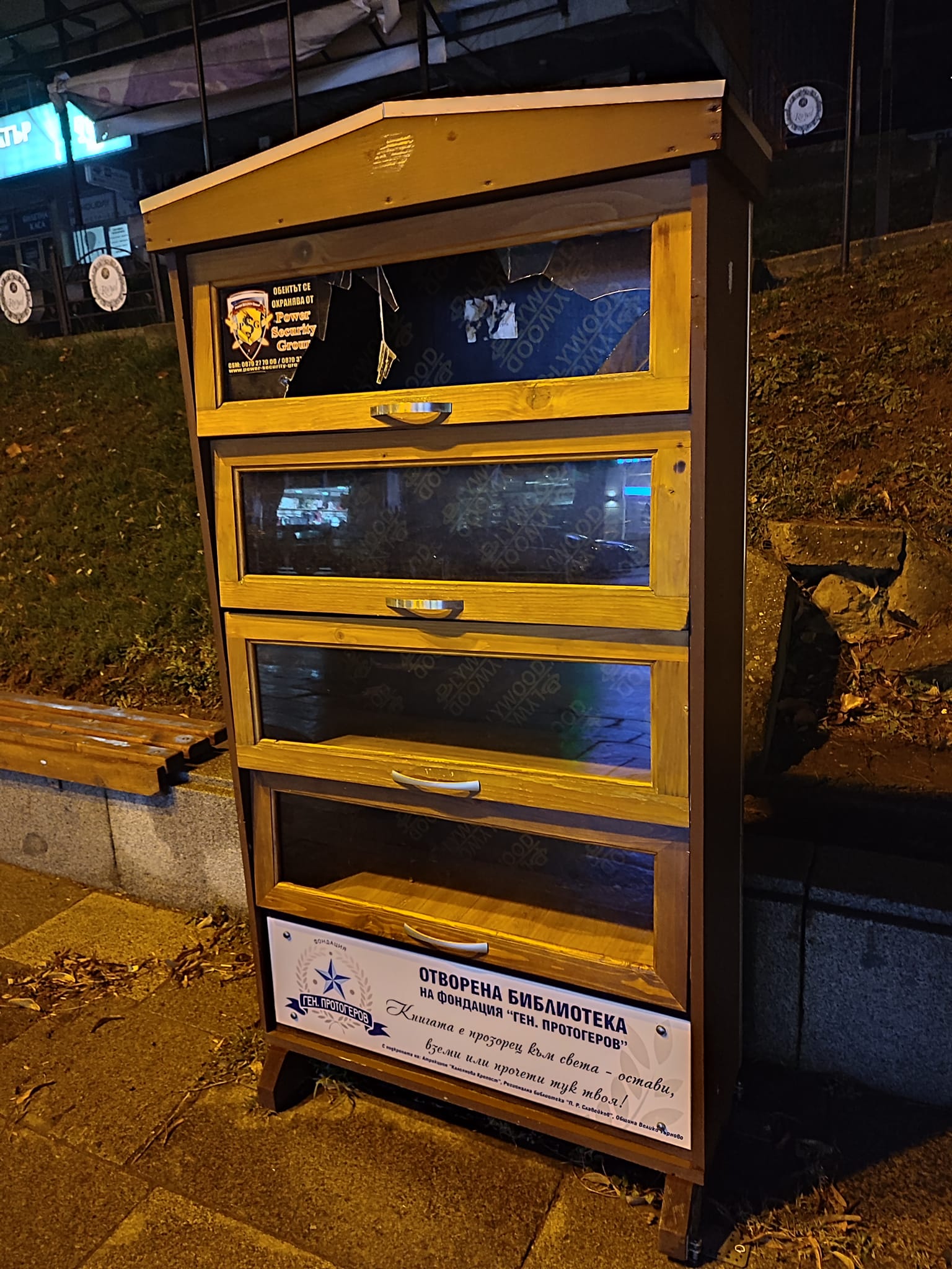 Цанко Данков е споделил в мрежата фотографията на дребната библиотека в Търново. Прави усещане още разбитото стъкло в горната част на уличната библиотека. Самият Цанко написа следното: