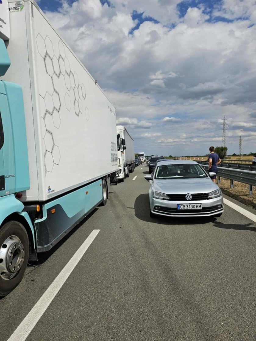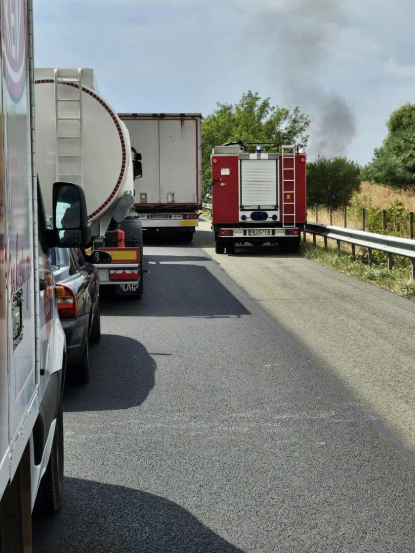 В непосредствена непосредственост до мястото на пожара, в спешната лента е спрял тежкотоварен камион поради спукана гума. В сектора водачите е належащо да се движат със съобразена скорост.