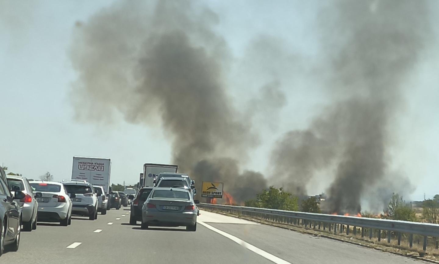 Пожар наоколо до автомагистрала " Тракия " наложи ограничение на придвижването