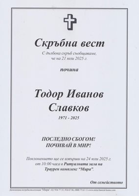 Поклонението пред Тодор Славков ще е на 24 юли (четвъртък) от 10 часа в ритуалната зала на траурния комплекс " Мира ". Славков умря на 21 юли в село Асен. На същия ден преди 44 година мъртва в държавната вила в Бояна е открита фамозната му майка Людмила Живкова. Тогава той е едвам на 10 години. Отново на 21 юли преди 4 година си отиде нейният брат и вуйчо на Тодор - Владимир Живков.