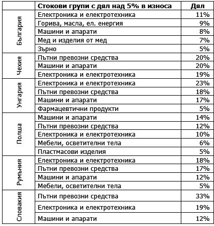 Пътни транспортни средства, машини и апарати, и електроника и електротехника образуват към и над 50% от износа на Чехия, Унгария, Румъния и Словакия, на Полша – 36%, на България – 22%. България, единствена от 6-те, има експорт на суровинна стокова група с дял в износа си над 5 % – горива, мед, зърно. Тази конструкция на българския експорт не благоприятства привличането на стратегически високотехнологични вложители.