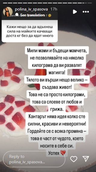 Поли направи и благо послание към бъдещите майки за силата на женската природа: " Мили мами и бъдещи мамчета, не позволявайте на няколко кг да ви скапват магията! Тялото ви прави нещо велико - основава живот! Това не са просто килограми, това са пластове от обич и грижа. Кантарът няма концепция какъв брой сте мощни, красиви и невероятни! Гордейте се с всяка смяна - това е част от чудото, което носите в себе си ".