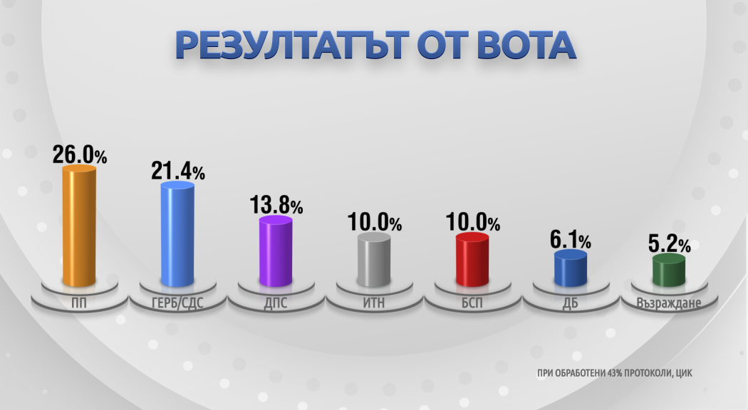 Според данните, оповестени на формалния уеб страница на ЦИК, 25.97% от гласоподавателите са дали своят вот за " Политическа партия ”. ГЕРБ остава на второ място с 21.42%, а Движение за права и свободи получава досега 13.79%. Партията " ИТН " е с 10.08% от гласовете. Българската социалистическа партия е на пета позиция с 9.99% от гласовете. Още две партии влизат в Народното събрание - " Демократична България " с 6.11% и Партия " Възраждане ", получила 5.19%.
