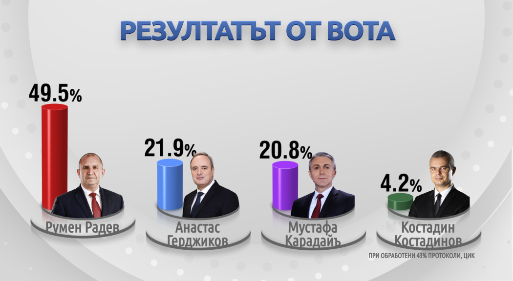 В избори те за президент на републиката досегашният държавен глава Румен Радев, който се кандидатира за втори мандат, води с 49.45%, подкрепената от ГЕРБ самостоятелна кандидат-президентска двойка Анастас Герджиков и Невяна Матеева е на второ място с 21.93%, което сочи към балотаж идната неделя. Трети е претендентът на Движение за права и свободи Мустафа Карадайъ, за който съгласно данните към 8 часа са дали своят вот 12.75%.