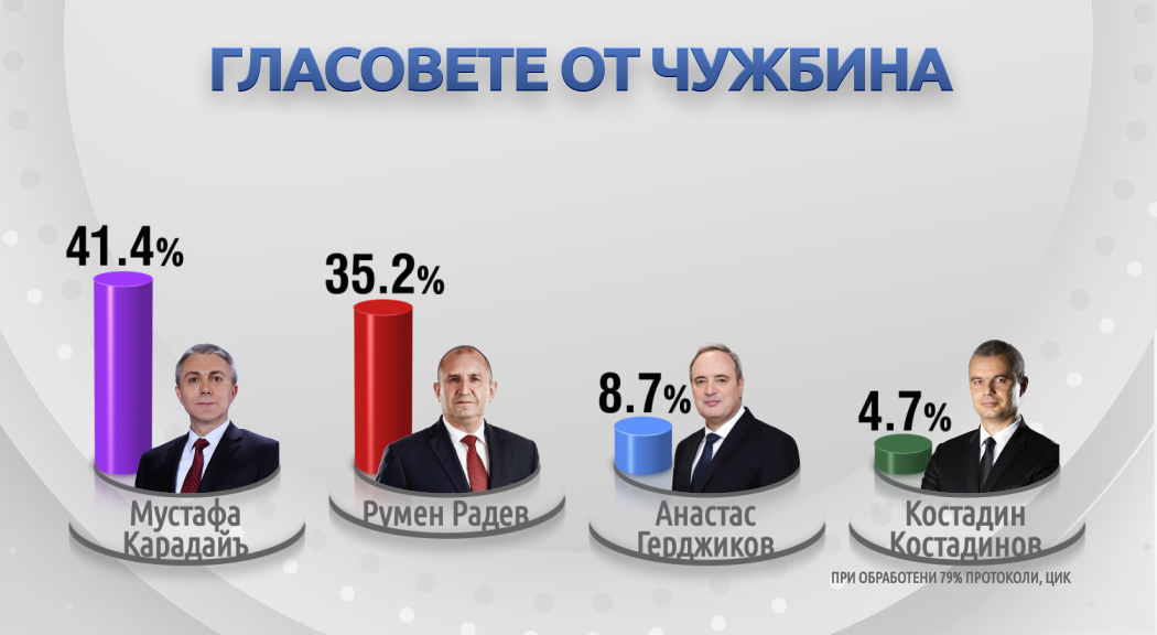 Според данните на ЦИК досега в борбата за президент отвън страната води Мустафа Карадайъ с 41.4%, следван от Румен Радев с 35.2 на 100. Третата позиция е за Анастас Герджиков, който събира 8.7% от гласовете зад граница. На четвърто място е Костадин Костадинов с 4.7%.