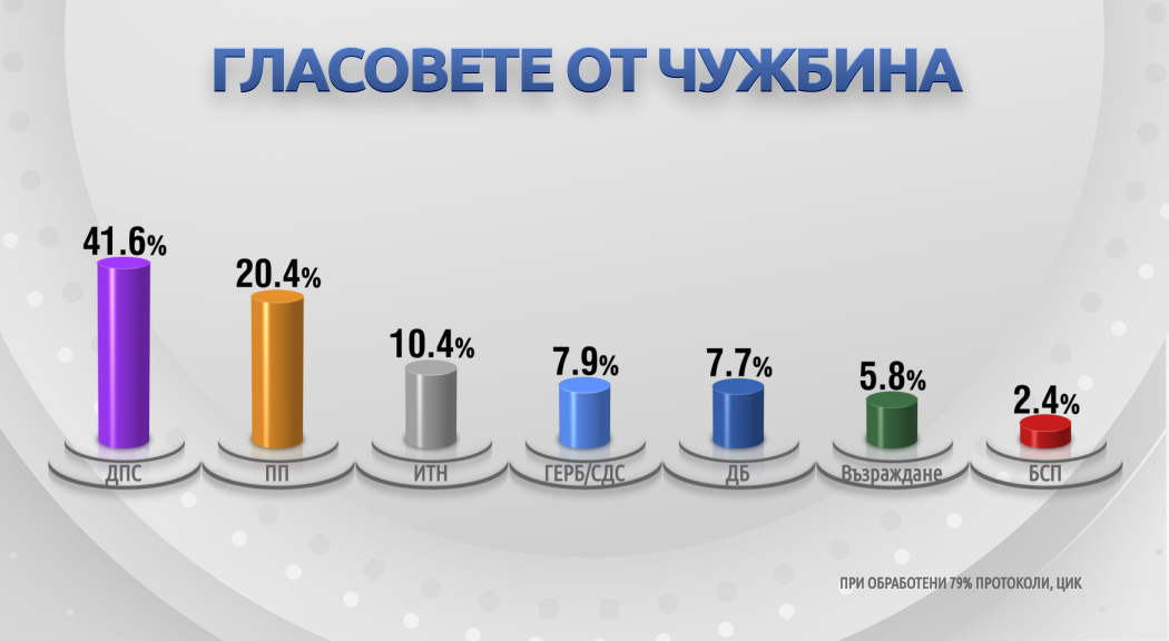 В ЦИК към момента няма пристигнала нито една РИК с протоколи от страната. Към 8 часа тази заран към 79 процента от протоколите от чужбина са били обработени. Резултатите показват, че най-вече поддръжка отвън страната събира Движение за права и свободи с 41.6%, следвани от " Продължаваме промяната " с 20.4%. На трето място са " ИТН " с 10.4 от гласовете, четвъртата позиция е за обединението ГЕРБ-СДС. Петото място при гласуването в чужбина е за " Демократична България ", които получават 7.7%. На шесто е партия " Възраждане " с 5.8%, а на последната позиция е Българска социалистическа партия с 2.4%.