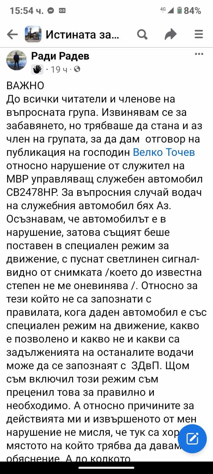 Униформеният, управлявал патрулка, дава отговор, че въпреки всичко тя е била на " специфичен режим ". Ради Радев се обосновава, че в тази ситуация е " било належащо ". Признава, че има нарушаване и е понесъл глоба.