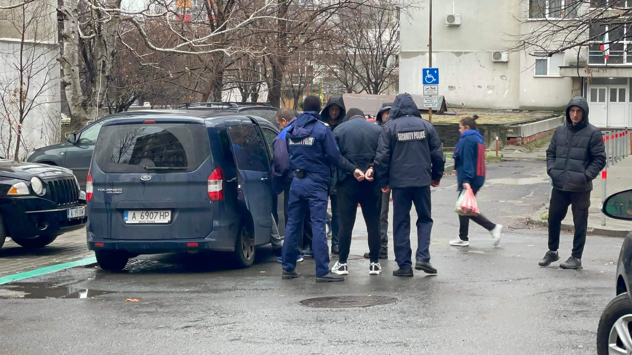 В ж. к. " Лазур " арестуват мъж пред входа на бл. 72. Отпечатъци се снемат от арестувания с белезници, заяви Флагман.