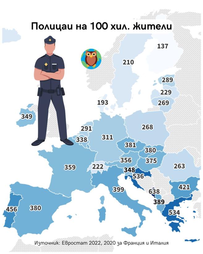 Графиката демонстрира броя служители на реда на 100 хиляди души население по страни съгласно Евростат. Сравнение в Европейския съюз (ЕС) сочи, че на глава от популацията или по-точно на 100 хиляди души междинният брой служители на реда варира мощно. Така съгласно последните налични данни България е измежду водещите страни по този индикатор с 421, нареждайки се само след Хърватия, Гърция и Португалия - надлежно с 536, 534 и 456. Най-малко служители на реда има в скандинавските страни и в прибалтийските републики, като Швейцария също изпъква с невисок брой отвън Европейски Съюз. Впечатляващ е ниският брой служители на реда във Финландия - едвам 137 на 100 хиляди поданици.