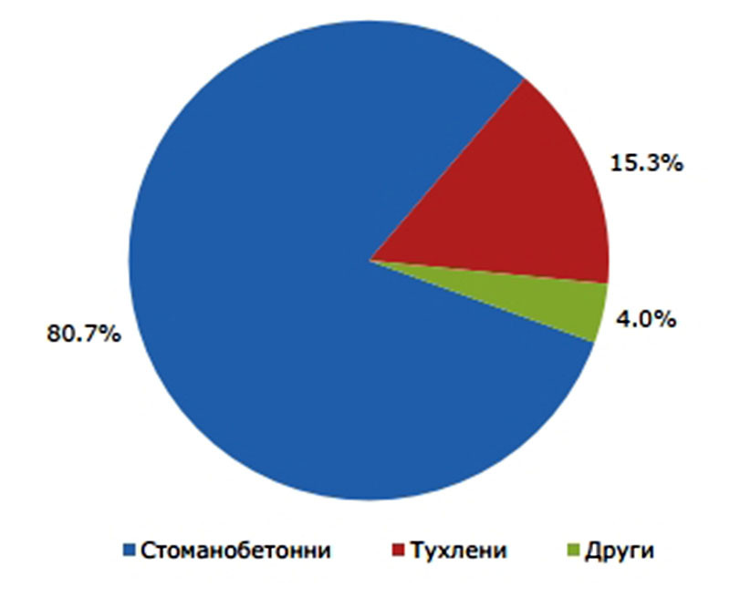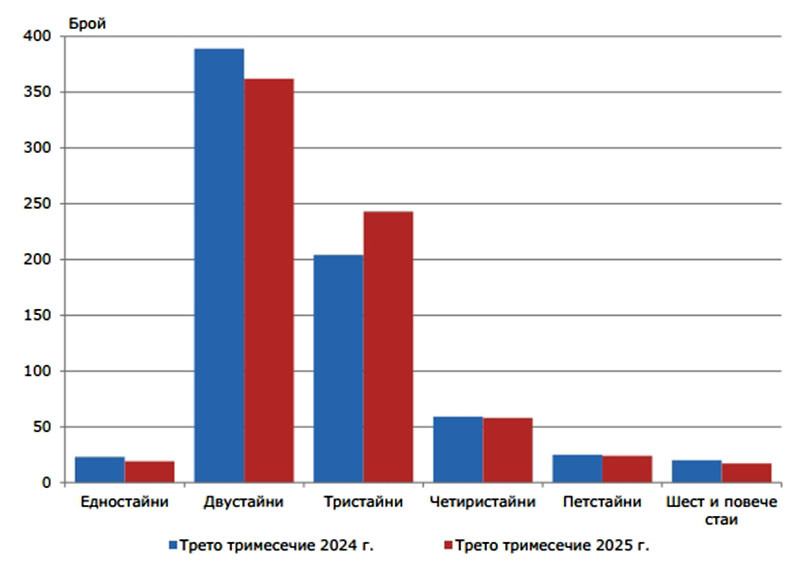 От въведените в употреба новопостроени жилищни здания през третото тримесечие на 2025 година със стоманобетонна структура са 80.7%, с тухлена - 15.3%, а с друга - 4.0%.