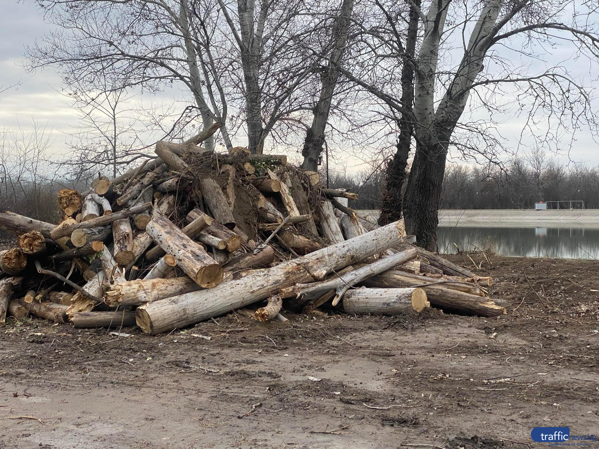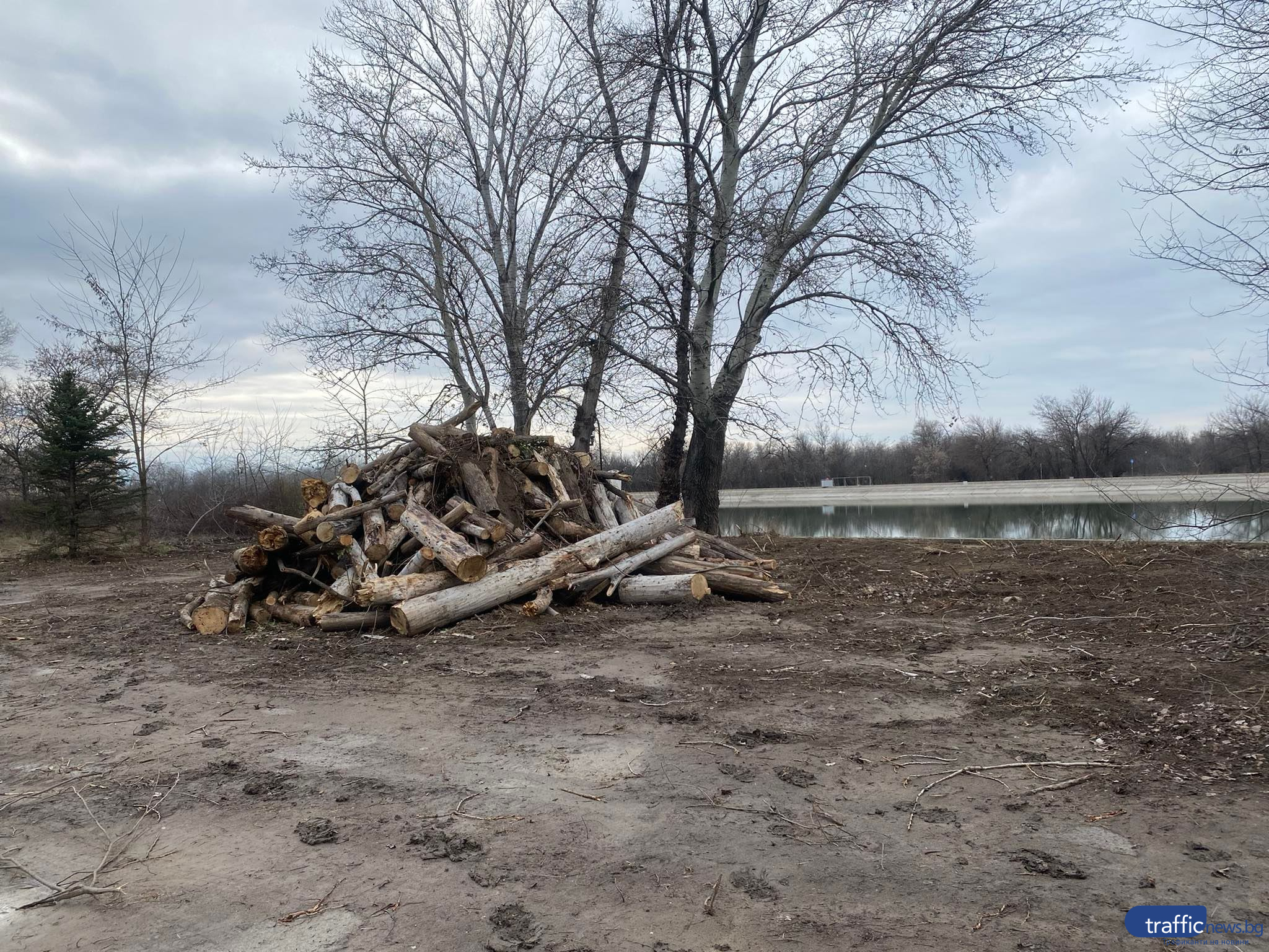 Поляна от близо декар и половина се появи в зелените площи край Гребния канал след " санитарната сеч ", която бе осъществена там преди няколко дни. На метри от водата има струпана голяма камара нарязани дървета, а теренът е усърдно прочистен.