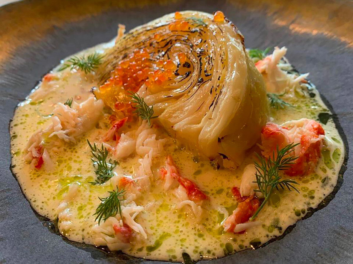 Извадете зелето от котлона, прехвърлете в чинии и сервирайте с гъст сметанов сос, раци, червен хайвер и копър.