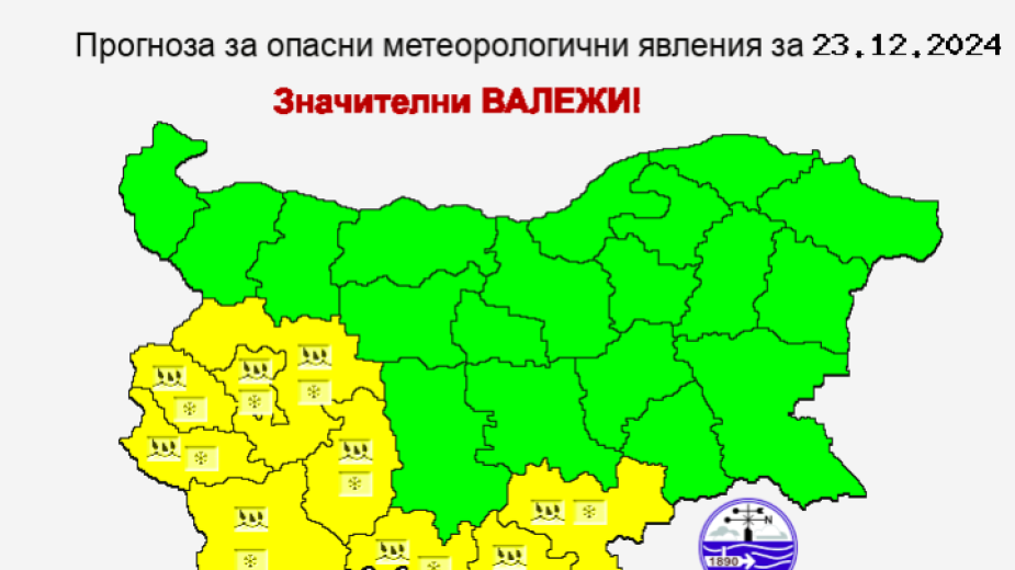 През деня на 23 декември ще бъде облачно и прохладно. Ще духа сдържан, северно от планините и в Източна България - краткотрайно мощен вятър от юг-югоизток. След обяд в Западна, а до вечерта и в Централна България ще стартират превалявания, обилни в Югозападна България и южните региони на област Хасково и Кърджали. В Предбалкана и високите западни полета ще превалява сняг, в останалата част от страната - дъжд, само че до вечерта и в останалите региони в Западна България дъждът ще премине в сняг. Максималните температури ще са най-вече сред 4° и 9°, в София - към 3°. Валежите ще продължат и през нощта против вторник.