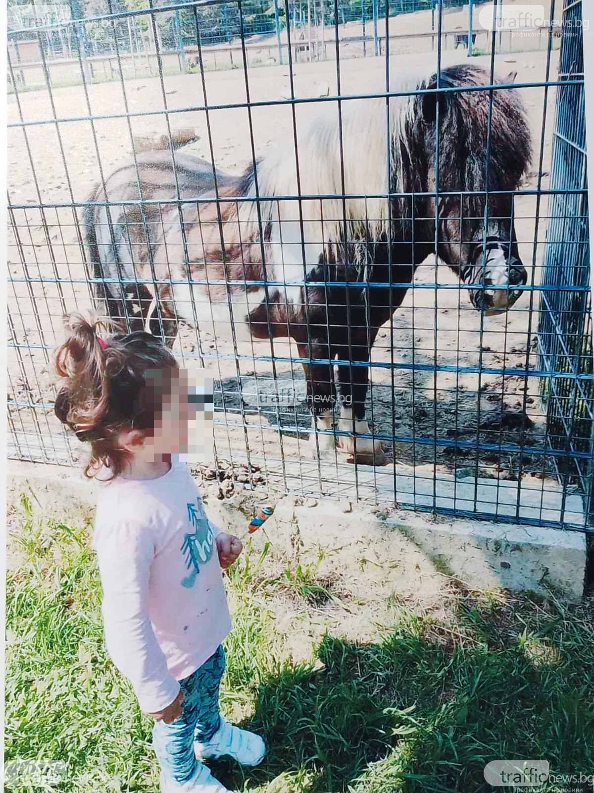 Що се отнася до близкия контакт с жителите на зоопарка – огромна част от клетките са отделени с защитни парапети. Да, само че не и тази на понито. Заграждението е направено от една мрежа, през която даже огромен човек може да промуши ръка.