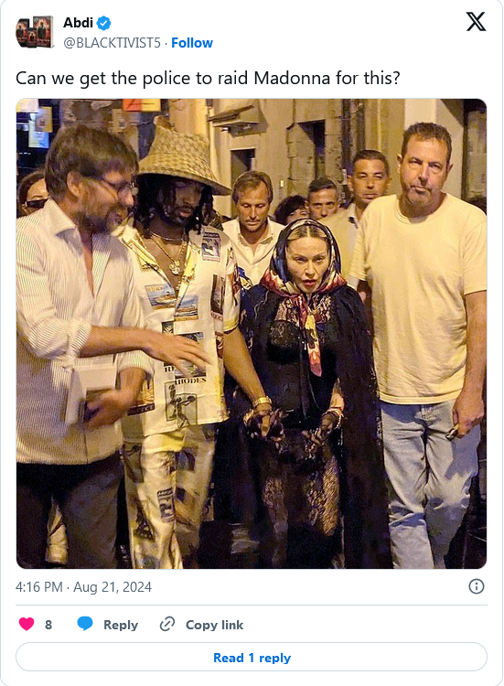 Мадона е в Италия по покана на стилните дизайнери Доменико Долче и Стефано Габана и е отседнала в имението им. За вечерта си с Аким тя носеше лют черен дантелен тоалет от стилната къща. Към двойката се причислиха дъщерите й близначки Естер и Стела, до момента в който разглеждаха локалните забележителности.