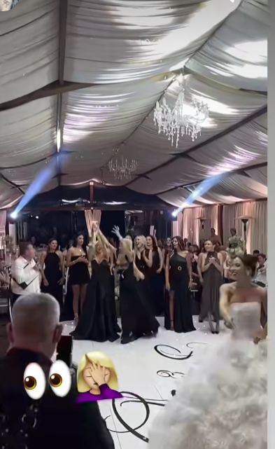 Освен че певицата е красиво и елегантно облечена в дълга черна рокля, по-интересното е видео, на което се вижда немислимото. При обичайния обред с хвърляне на букет от булката , откакто цветята политат във въздуха, в последна сметка печеливша се оказва точно Емануела.
