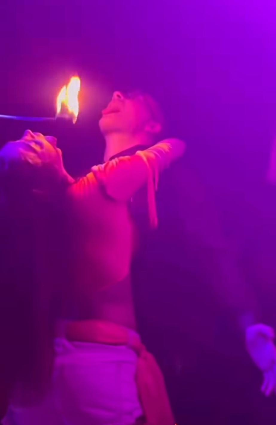 Пред очите на близо 500 души, останали да се забавляват в дребните часове на нощта, певицата налапа цели две горящи факли и с голо гърло ги загаси. Досущ като в цирка, Ариа не се спря пред нищо, до момента в който не потуши пожара.