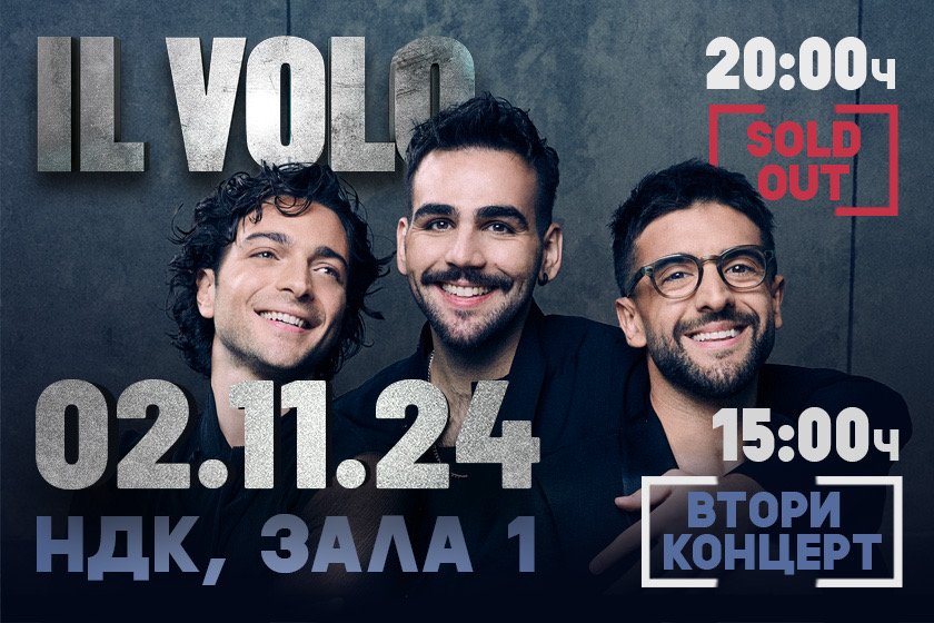 Вторият концерт на IL VOLO ще бъде на 2 ноември 2024, от 15:00 ч., в зала 1 на НДК. Билети - в системата на Eventim, в всеобща продажба от 11.09.2024 г.